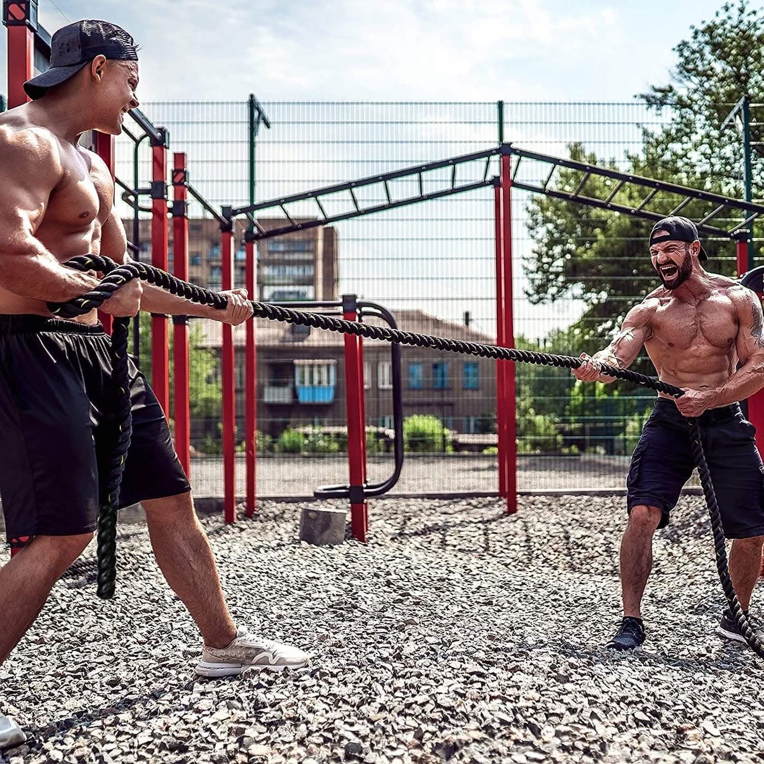 The Battling Rope is made through a special double-braiding process that creates an soft and extremely strong rope. They are built to withstand rigorous use and will last for years to come. They are very comfortable to hold onto and will not shed, making them ideal to use indoors or outdoors. They have an excellent strength ratio and are heavy ropes to use. They also have a high abrasion resistance and due to them being double-braided, they won’t stretch like some 3-strand nylon or poly ropes. Like all our battling/fitness ropes, they come standard with heavy-duty vinyl handles on both ends.