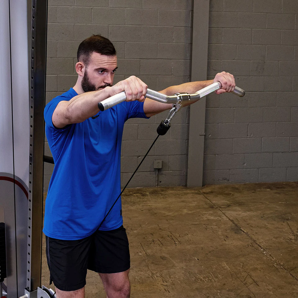 The Body-Solid Tools MB229A Aluminum Curl Bar attaches to any home gym or cable/pulley-based weight machine and helps you perform curls and numerous other exercises. Constructed from high-strength, rust-proof and lightweight 1-¼” aluminum, the MB229A is both durable and lightweight. Knurled grips offer consistent handling even during intense workouts while the angles on the MB229A were designed specifically for peak biceps and triceps contraction. The smooth, fluid center of the MB229A swivels and rotates in constant, steady, uninterrupted motion and increased exercise variety.