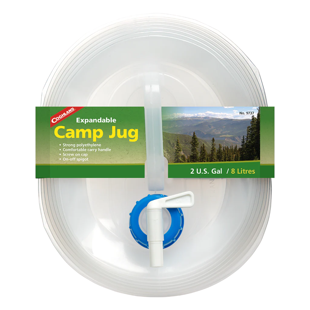 The unique press and flow capability of our camp jug allows pouring in an upright position. Strong polyethylene construction features a comfortable carry handle and screw on cap with an easy one-handed on-off spout.