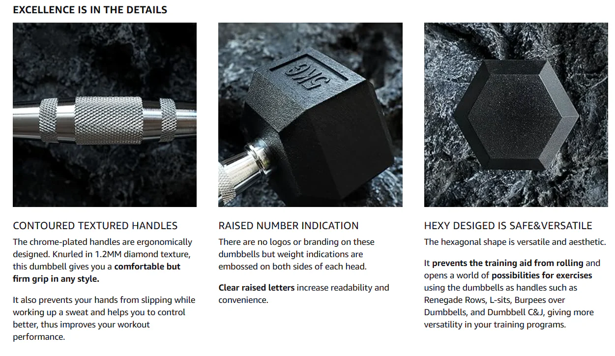 SUPERIOR CONSTRUCTION: Crafted from high-quality, durable cast iron, Therapy Fitness dumbbells boast exceptional durability. The handles are cast iron with a chrome coating, while the hexagonal weights are encased in rubber for added protection.