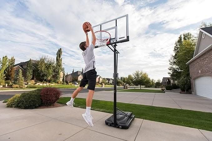 Features Front Adjust height adjustment mechanism; easily adjusts from 7.5 to 10 feet. 3 Piece Powder Coated Steel Round Pole, Adjustment Increments: 6 inches