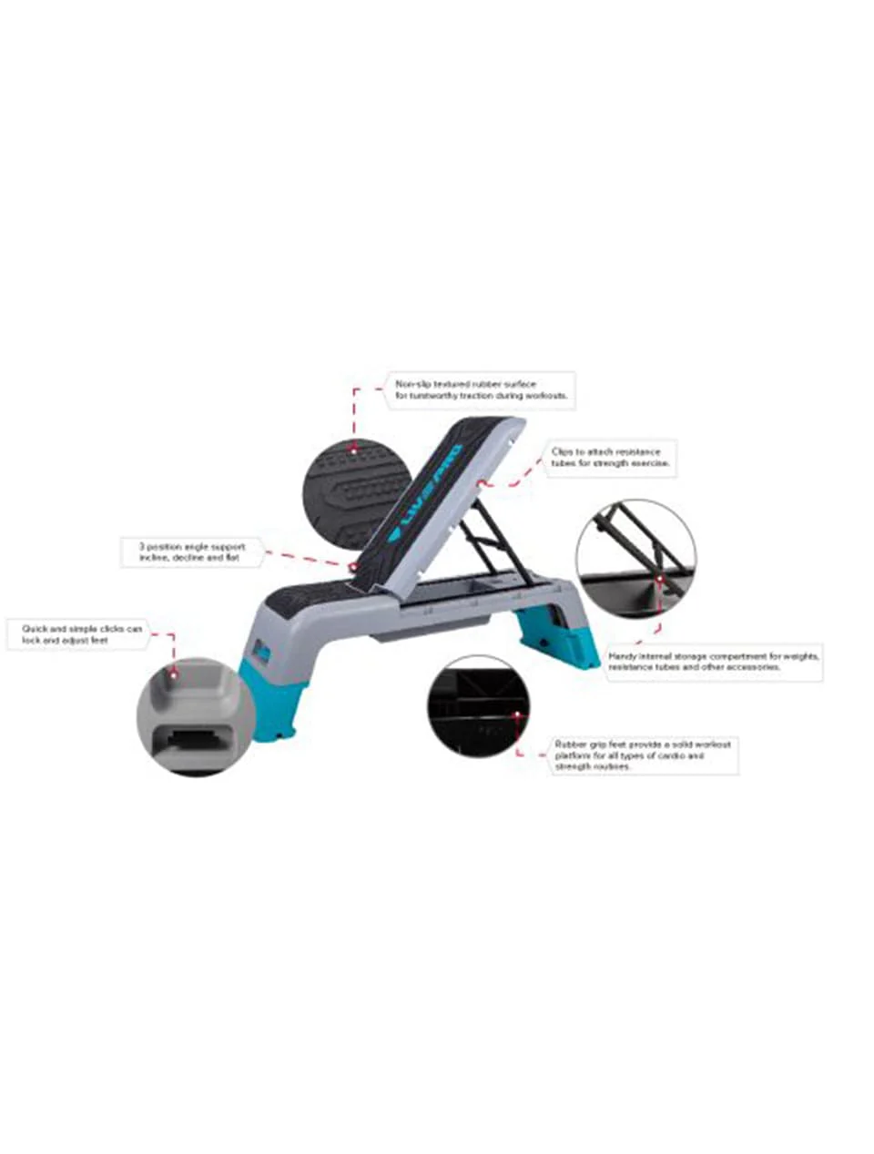 The LivePro Multifunction Step is a versatile piece of exercise equipment designed to help users perform a variety of workouts and exercises. It is a sturdy and durable platform made from high-density polyethylene and can support up to 250 kg of weight. The step has three adjustable height levels (15cm, 20cm, and 25cm), allowing users to customize their workout intensity.