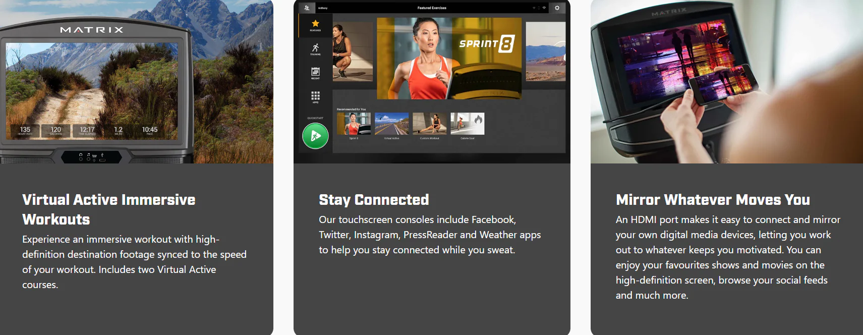 | Programs/Workouts | 13 Preset Programs including Manual, Rolling Hills, Intervals, Constant Watts, Sprint 8®, Virtual Active |