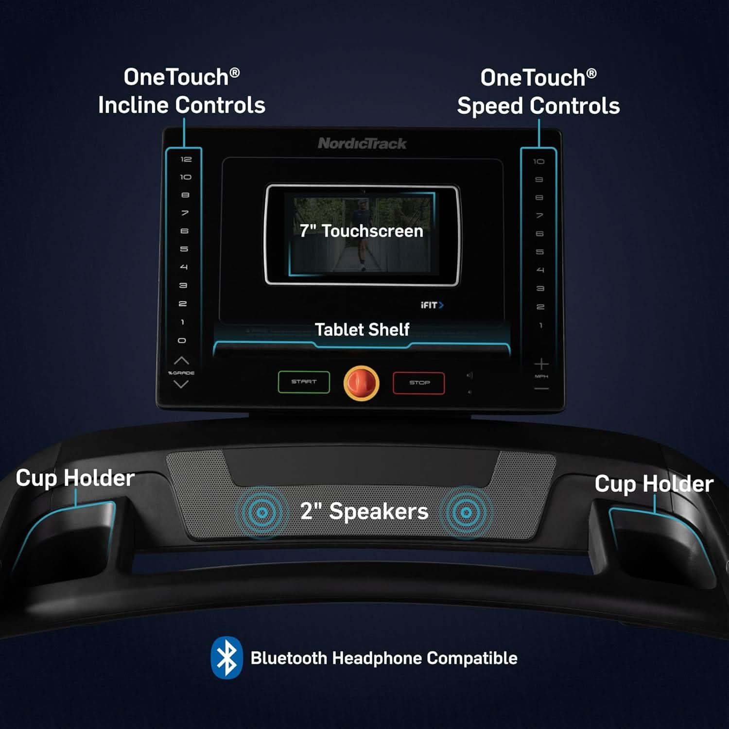 The NordicTrack EXP 7i is an entry-level treadmill from NordicTrack, featuring a 7″ touch screen. It has a 55″ x 20″ belt, a top speed of 10 mph, and an incline up to 11.4%, making it suitable for walking and running, though more serious runners might seek additional features. The Runners Flex Cushioning offers excellent shock absorption for users up to 300 pounds.