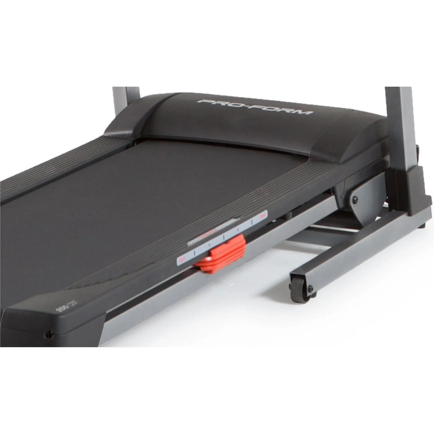 The ProForm 105 CST Treadmill features a convenient Space Saver design, enabling you to store the machine in a vertical position, while the EasyLift Assist delivers a powerful shock that will help lift the deck with an easy push.