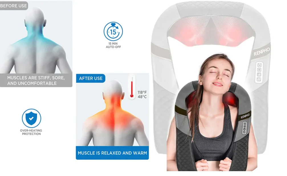 RENPHO neck massager with heat on massage rollers gives your body warmth and improves circulation. 15 mins intelligent auto-off timer and overheat protection system bring you hassle-free safety. Bi-directional movement of this neck massager for pain relief deep tissue is optional making it an excellent value