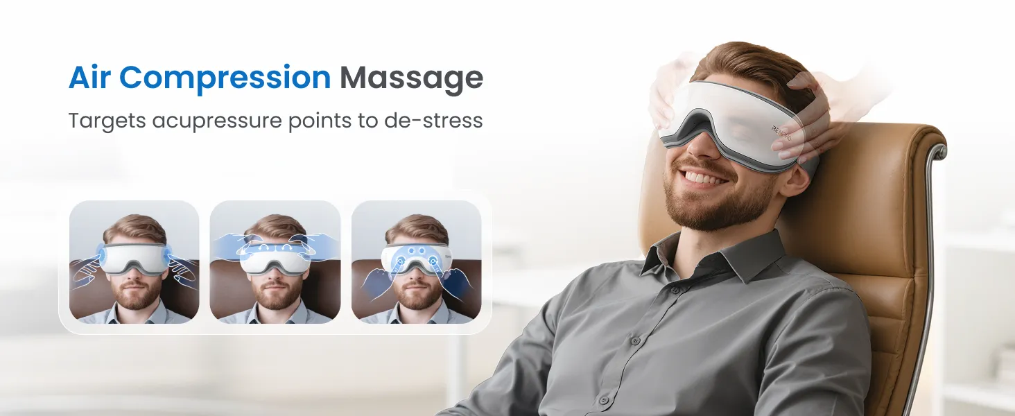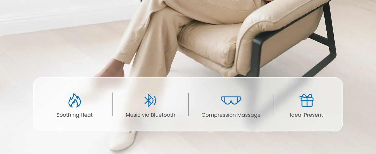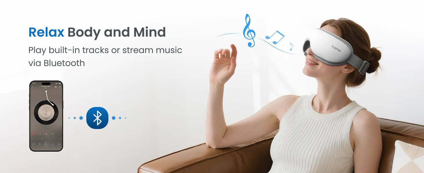 RENPHO sleep eye mask can block out light and help soothe tired eyes by providing a relaxing warmth that can reduce stress and enhance sleep quality. Our eye machine adopts oscillating pressure and rhythmic percussion massaging, it can make the skin around the eyes more relaxed.