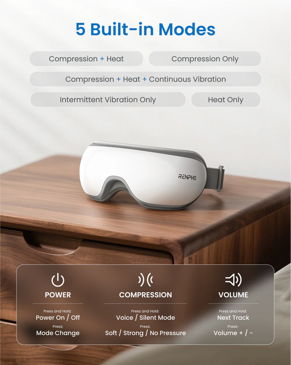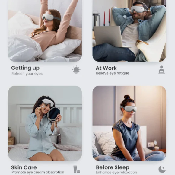 Eye massager Renpho built-inbuilt-in heating pads provide a comfortable temperature 104℉-107℉, better for relieving eye strain, reduce dry eyes, puffiness, etc. After skin care also help eye cream absorb. Note 1: The eye mask massager NOT suitable for who have undergone eye operation, retina condition, cataract, glaucoma, etc.