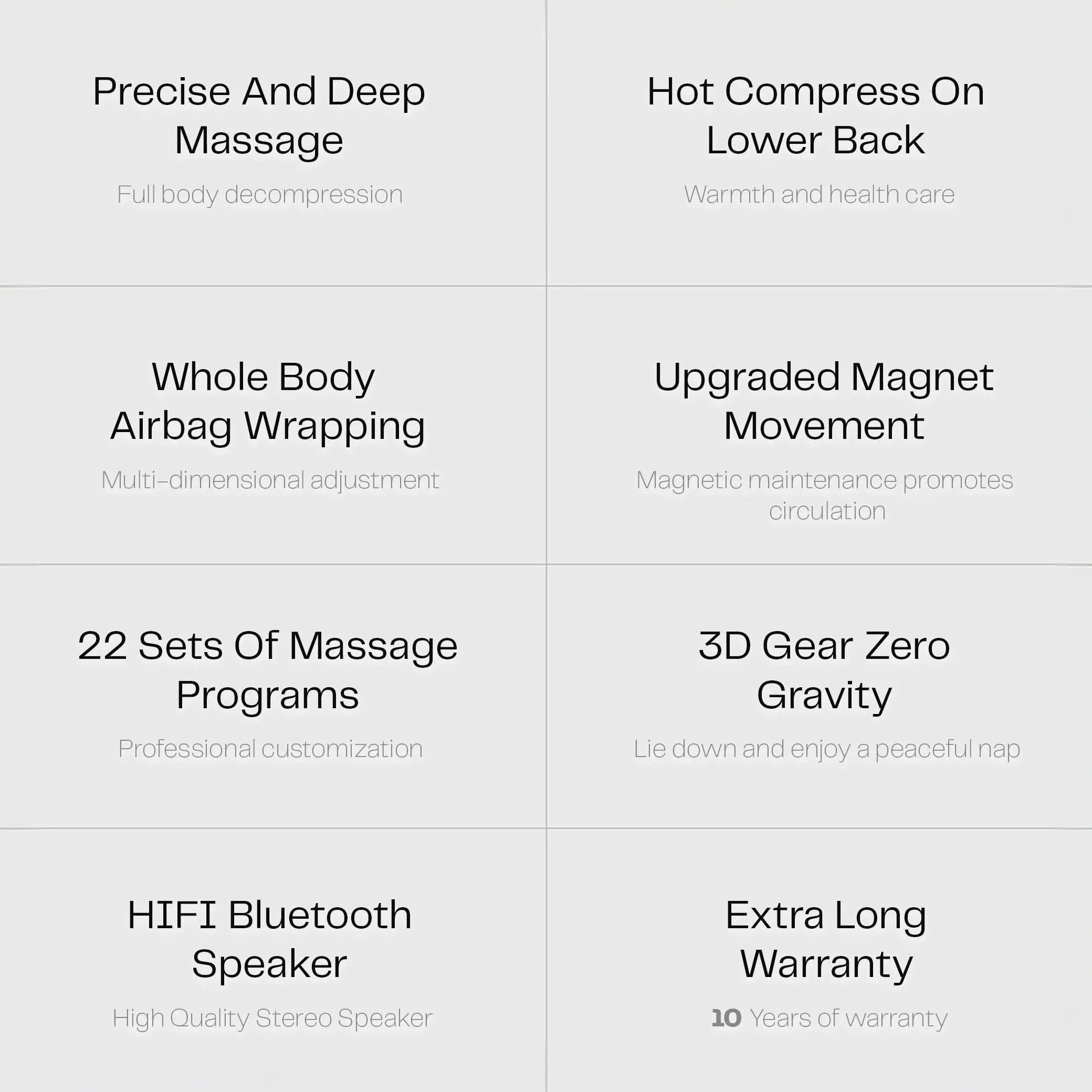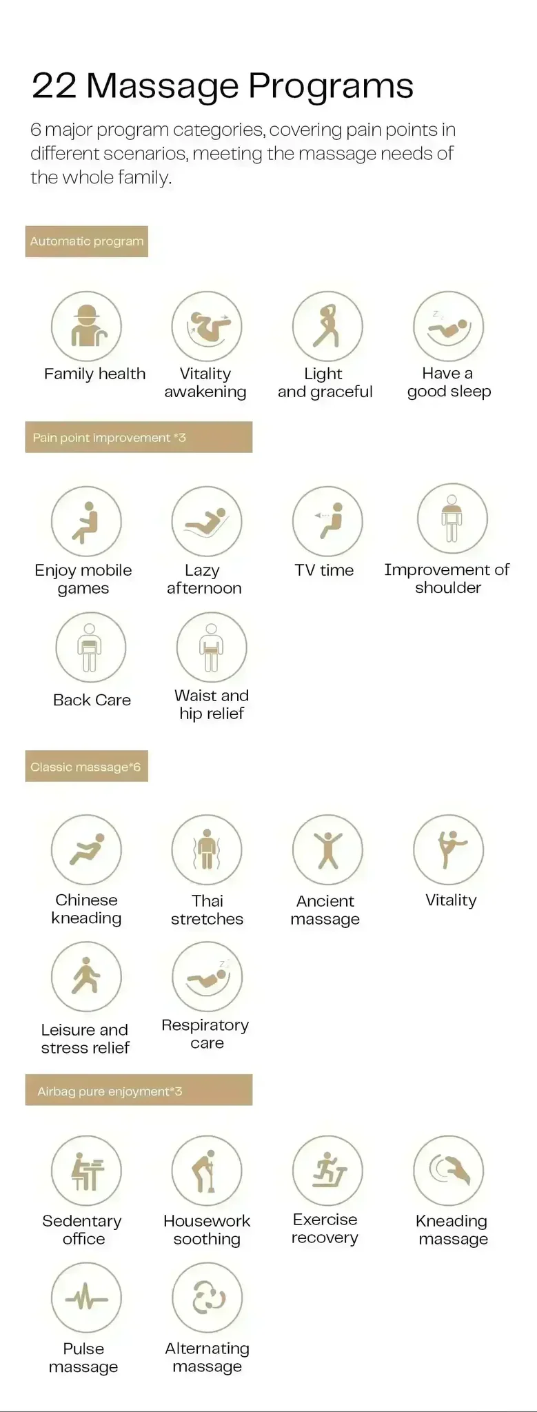 22 Auto Programs: Choose from 22 unique massage modes like Thai, Chinese, Deep Tissue, Stretch, and Recovery, offering versatile options for total body relief.