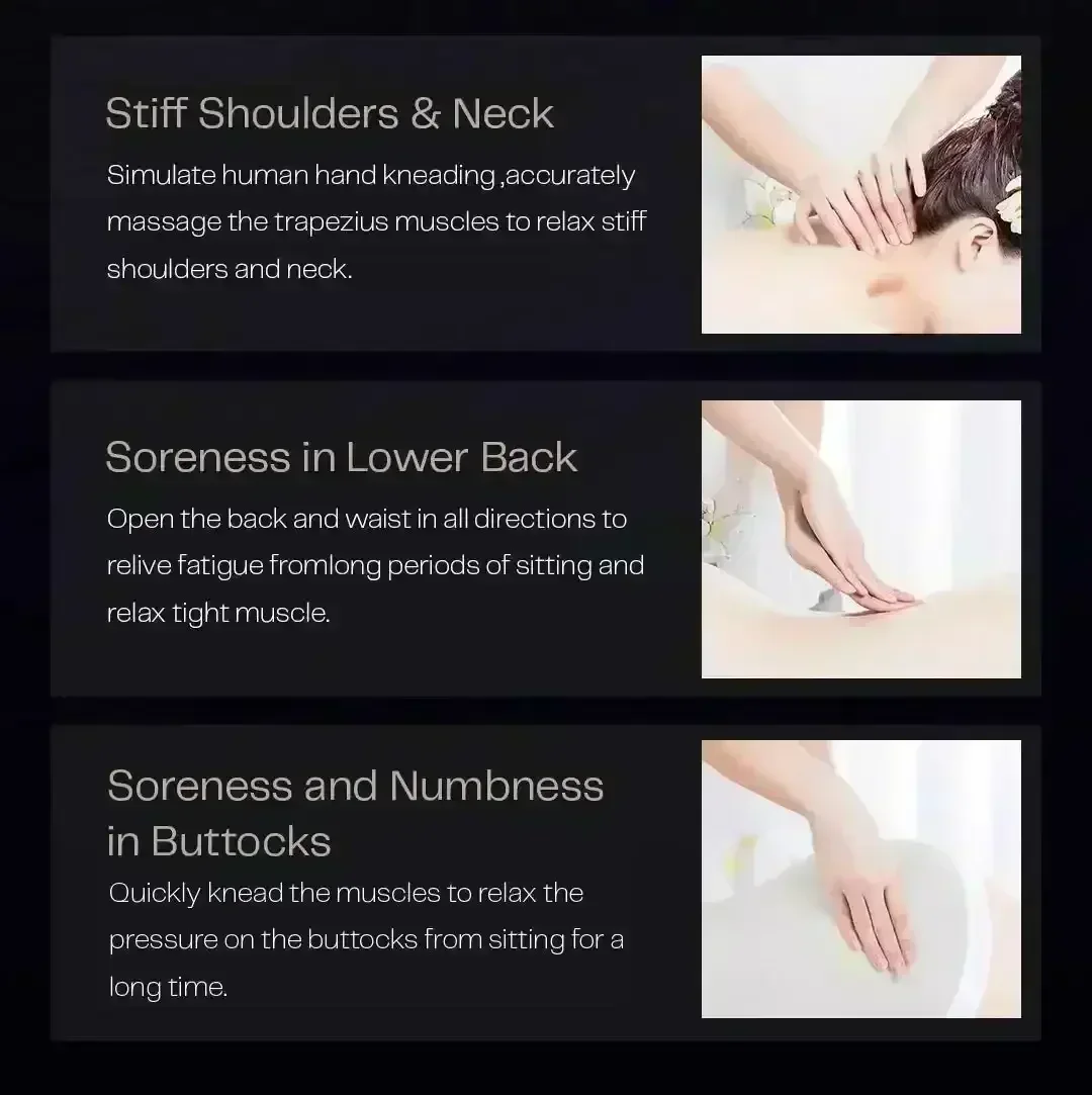 Heated Back & Calf Zones: Targeted heat therapy on the back and calves reduces muscle stiffness, enhancing relaxation during your massage.