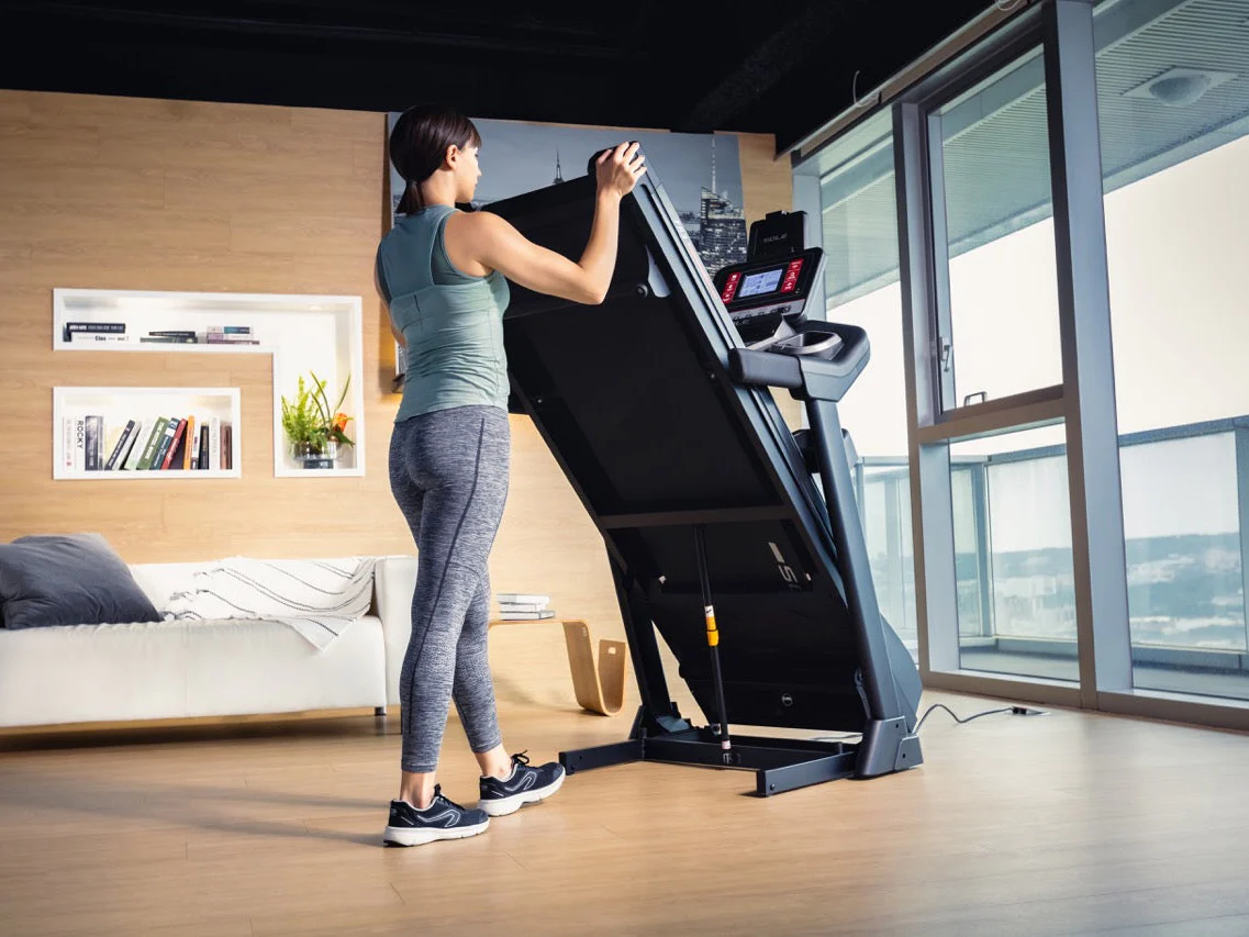 The treadmill folds vertically to save space without compromising stability, making it a perfect addition to any home gym.