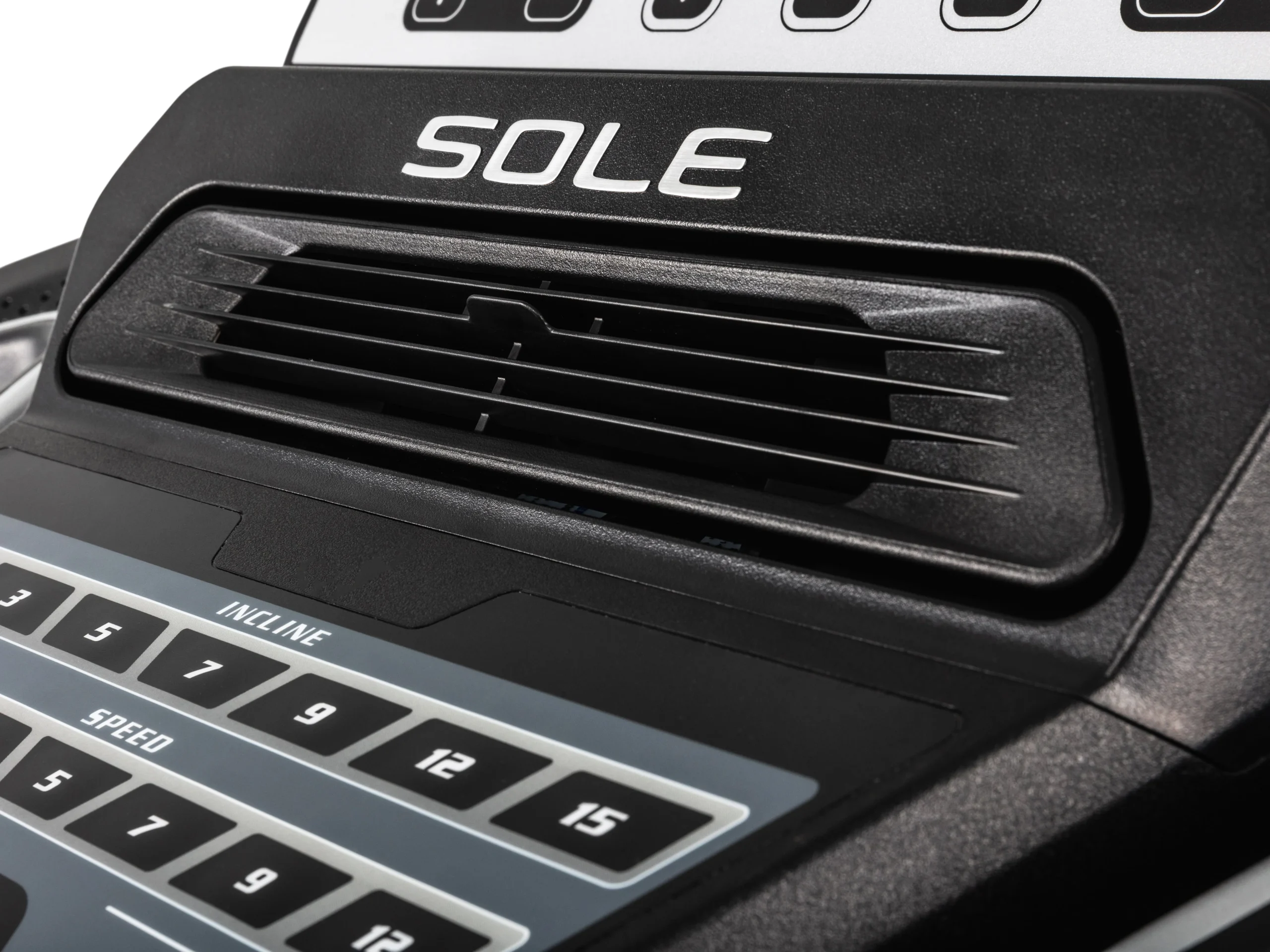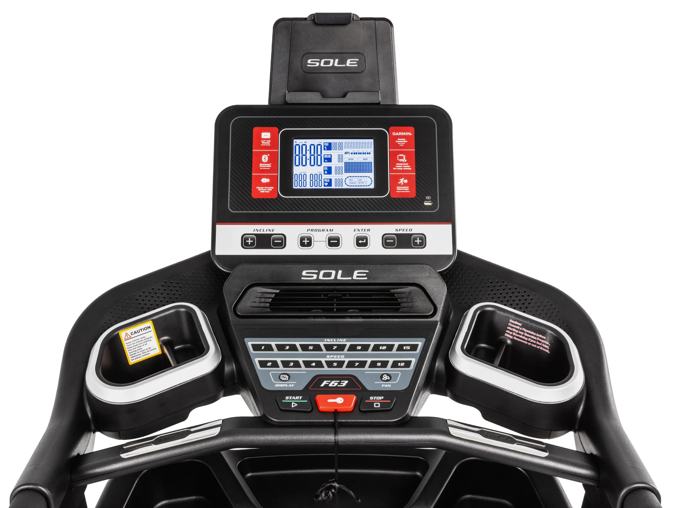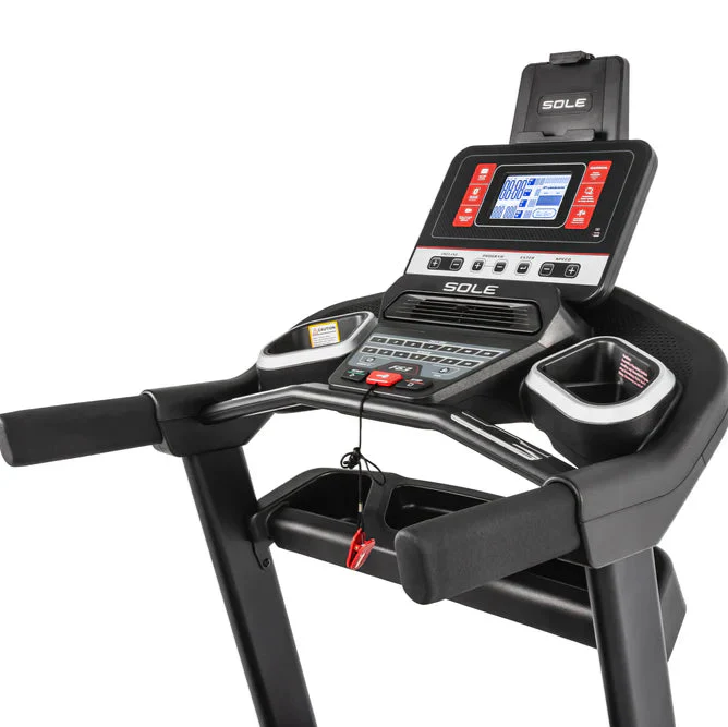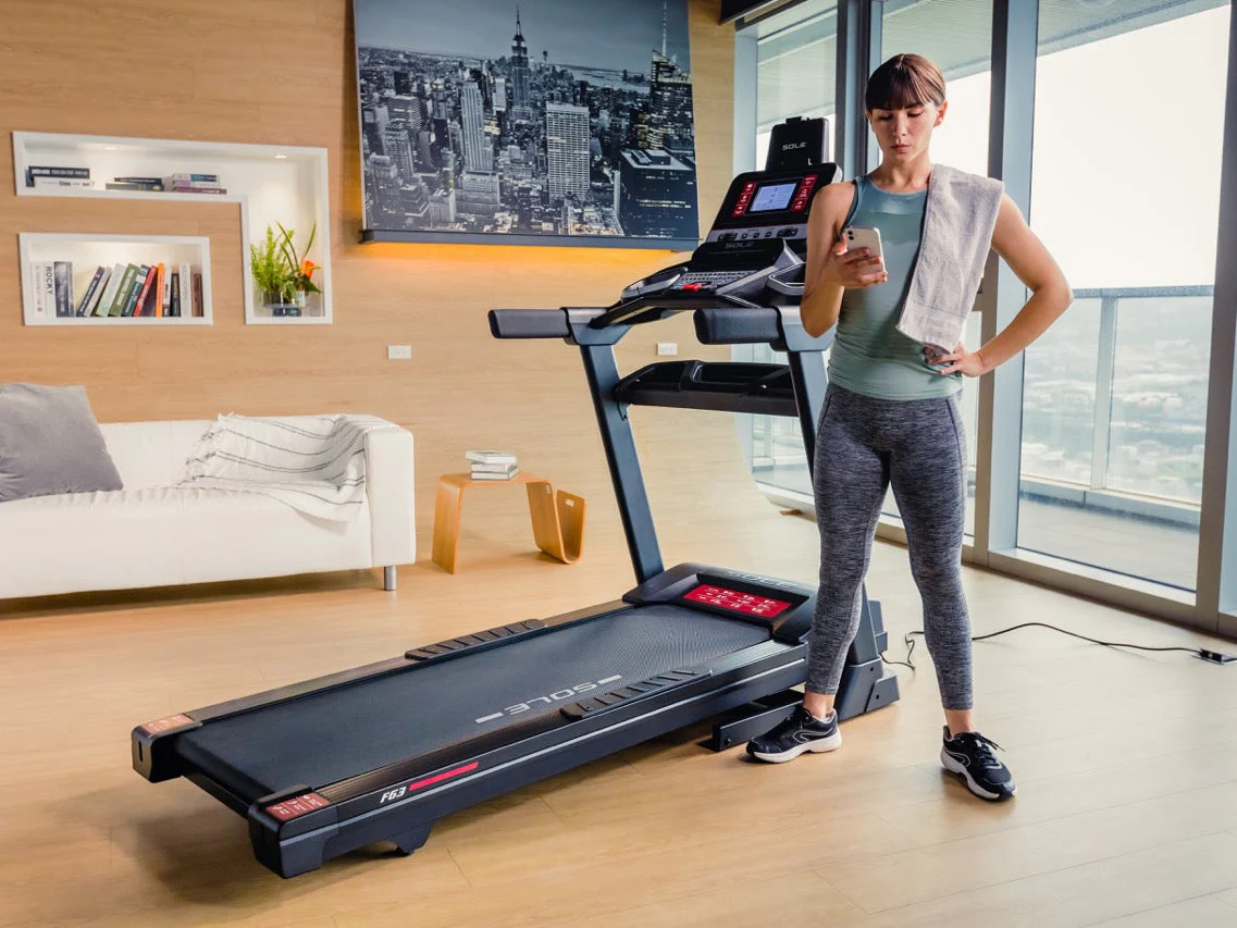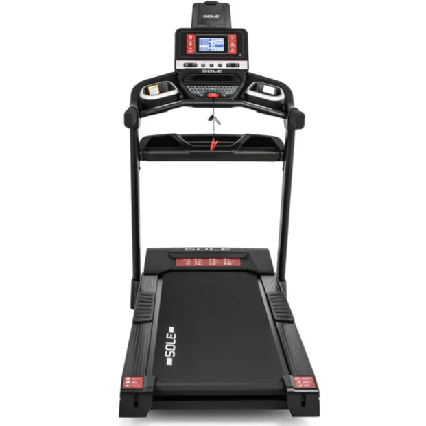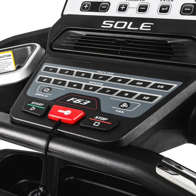 The SOLE F63 Treadmill features an intuitive control panel for easy workout adjustments.