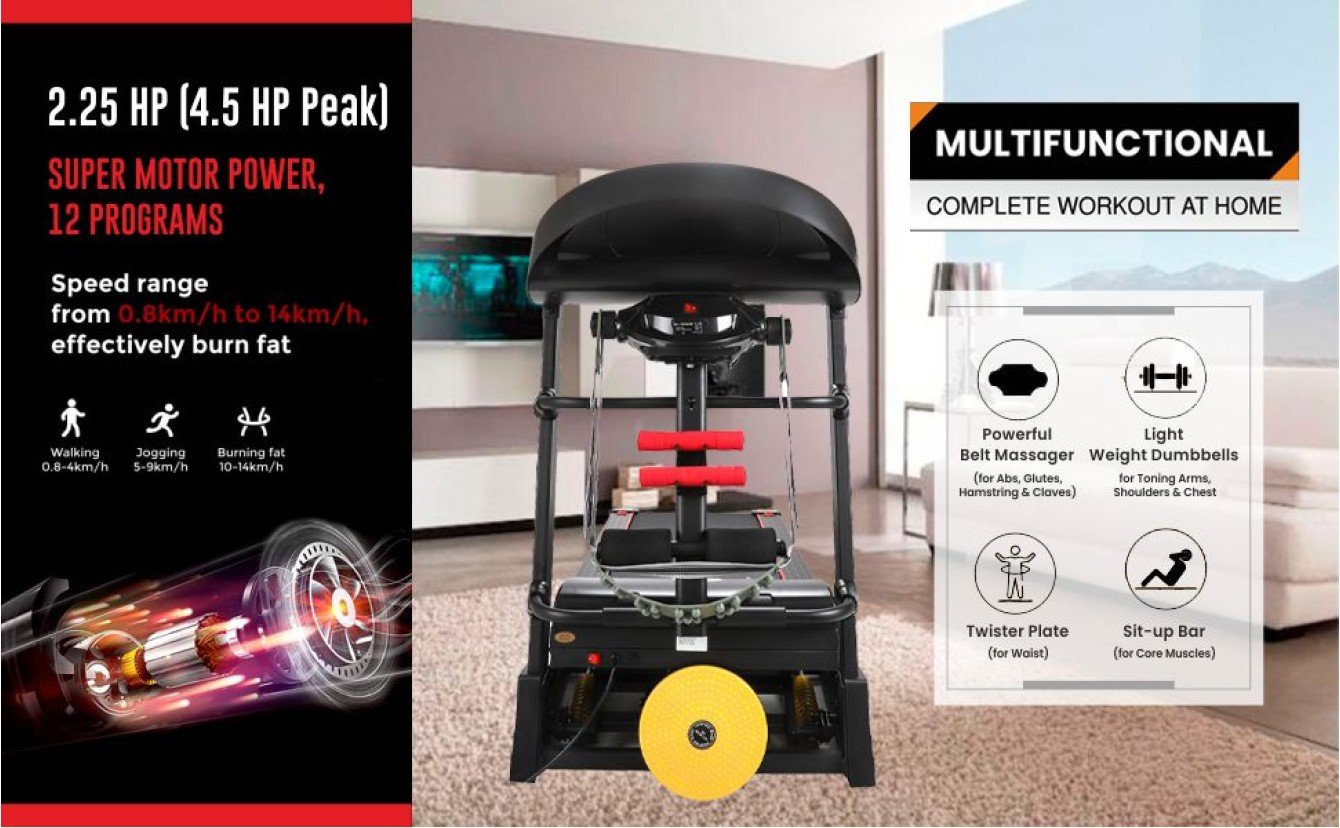 MULTIFUNCTION – This treadmill is loaded with Multifunction utility including Powerful Massager, Sit-up, Dumbbells, and Twister for Hips, Thigh, and Stomach, etc.