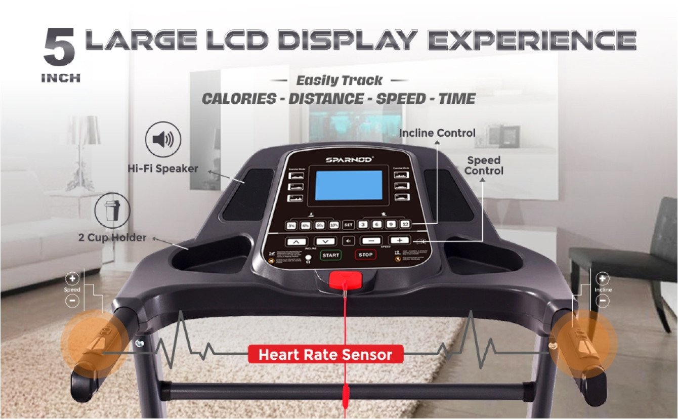 FEATURES – This Treadmill is also equipped with AUX input to listen to music from your iPhone or MP3 player while exercising, Wheels for easy transportation. The pulse sensor enables you to monitor heart rate Equipped with one 5 Inch LCD display at the front allowing you to easily monitor your time, calories, distance, speed, and heart rate.